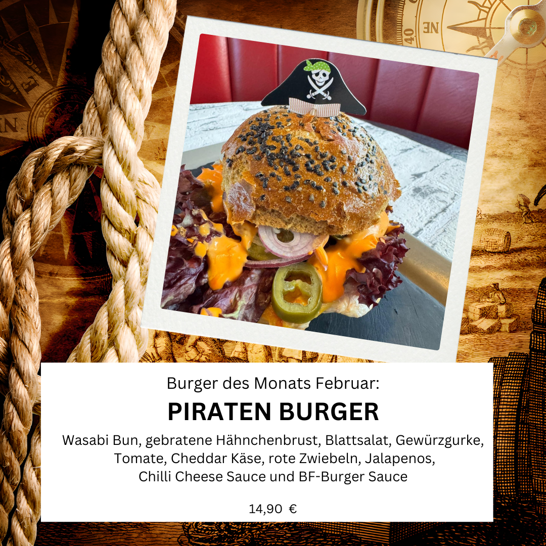 Unsere Kombüse zaubert im Februar den Piraten Burger auf deinen Teller!🏴☠️ Aye, aye und BF in Sicht!